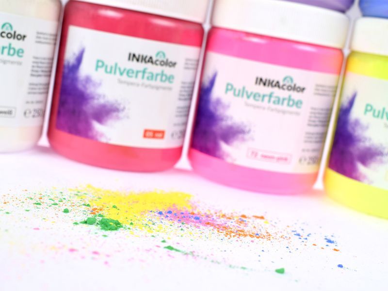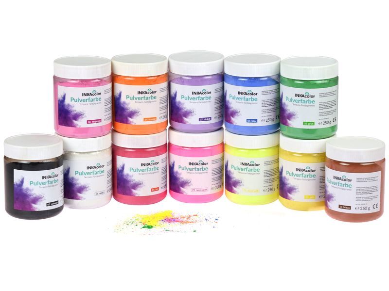 Die INKAcolor Pulverfarben sind Farbpigmente, die mit Wasser selbst zu einer Malfarbe angerührt werden. Du bestimmst, ob sie intensiv deckend oder nur leicht farbig sein soll. Willst du eine Relief-Struktur auf die Leinwand zaubern, Holz lasieren oder kreative Farbverläufe zaubern? Dann ist die INKAcolor Pulverfarbe dein neuer Begleiter. Die Pulverfarbe besteht aus konzentrierten Tempera-Farbpigmenten, die mit Wasser angerührt eine universelle Wassermalfarbe ergeben. Die Farbe lässt sich im Handumdrehen jederzeit anrühren und ist malbereit. Das ist ganz leicht: Das Tempera-Farbpigment einfach in eine kleine Schale geben und mit ein wenig Wasser verrühren, schon kann der Malspaß beginnen. Die angerührte Farbe verhält sich beim Malen wie eine Wasserfarbe – nur mit dem besonderen Experimentier-Effekt! Mische verschiedene Konsistenzen, tauche den feuchten Pinsel in das trockene Pulver, streue etwas Pulver auf eine feuchte (farbige) Fläche, mische die Farben trocken oder feucht miteinander, benutze Spachtel, Sieb, Tücher und mehr! Mit der Pulverfarbe entdeckst du immer wieder neue Maltechniken. Die Tempera-Pigmentfarben von INKAcolor sind für viele Materialien und Untergründe geeignet, beispielsweise Leinwände, Papier, Holz oder Stein. Je nach Einsatz muss nur das Mischungsverhältnis angepasst werden.
