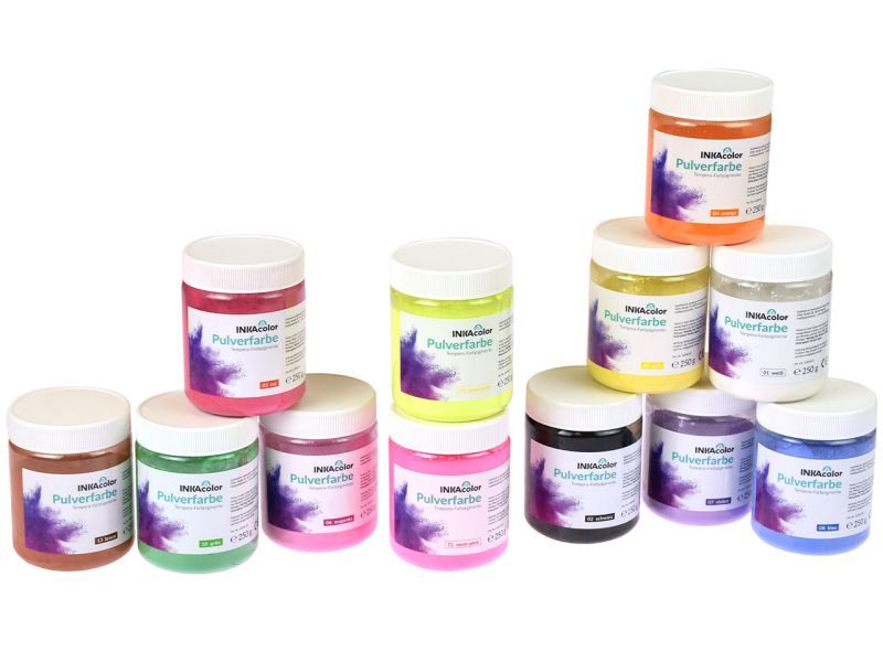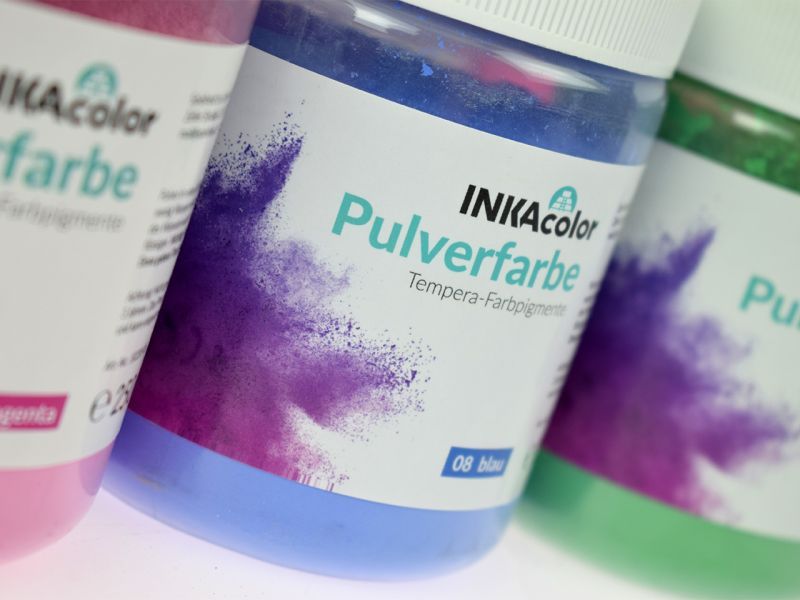 Die INKAcolor Pulverfarben sind Farbpigmente, die mit Wasser selbst zu einer Malfarbe angerührt werden. Du bestimmst, ob sie intensiv deckend oder nur leicht farbig sein soll. Willst du eine Relief-Struktur auf die Leinwand zaubern, Holz lasieren oder kreative Farbverläufe zaubern? Dann ist die INKAcolor Pulverfarbe dein neuer Begleiter. Die Pulverfarbe besteht aus konzentrierten Tempera-Farbpigmenten, die mit Wasser angerührt eine universelle Wassermalfarbe ergeben. Die Farbe lässt sich im Handumdrehen jederzeit anrühren und ist malbereit. Das ist ganz leicht: Das Tempera-Farbpigment einfach in eine kleine Schale geben und mit ein wenig Wasser verrühren, schon kann der Malspaß beginnen. Die angerührte Farbe verhält sich beim Malen wie eine Wasserfarbe – nur mit dem besonderen Experimentier-Effekt! Mische verschiedene Konsistenzen, tauche den feuchten Pinsel in das trockene Pulver, streue etwas Pulver auf eine feuchte (farbige) Fläche, mische die Farben trocken oder feucht miteinander, benutze Spachtel, Sieb, Tücher und mehr! Mit der Pulverfarbe entdeckst du immer wieder neue Maltechniken. Die Tempera-Pigmentfarben von INKAcolor sind für viele Materialien und Untergründe geeignet, beispielsweise Leinwände, Papier, Holz oder Stein. Je nach Einsatz muss nur das Mischungsverhältnis angepasst werden.